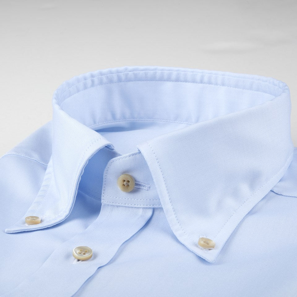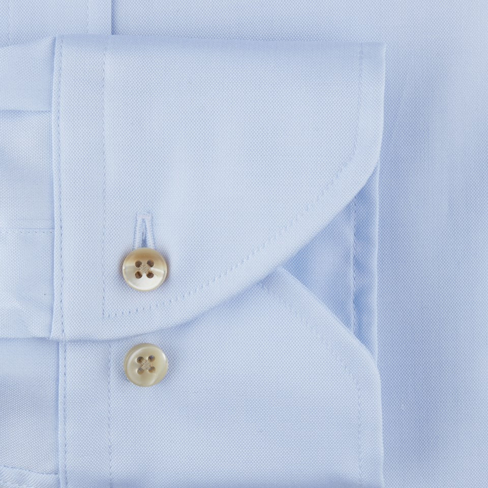Light blue casual Oxford shirt, in a fitted body model, made of twofold cotton. The shirt is designed with mother of pearl buttons, single cuffs, and a button down collar.