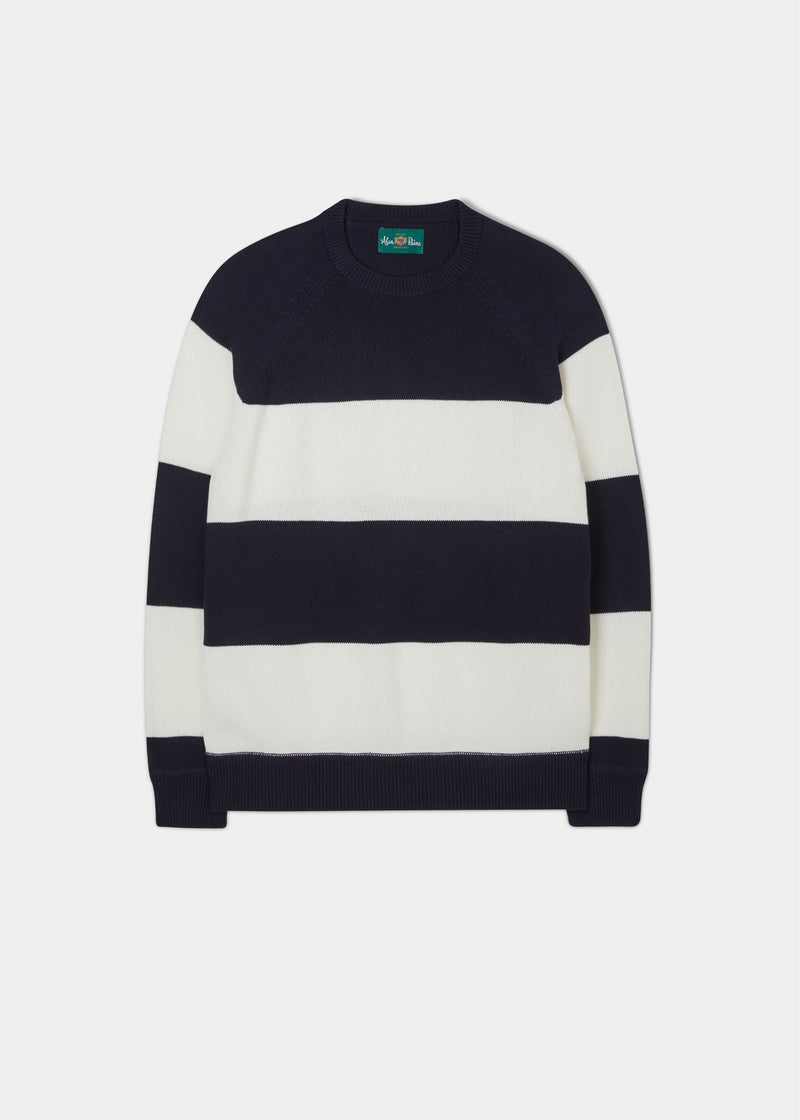 It’s time to upscale your summer casual wear with this striking block stripe jumper in timeless dark navy and ecru. Crafted from comfortably soft, comfortably cool cotton, team with chinos or shorts for effortless summer style.