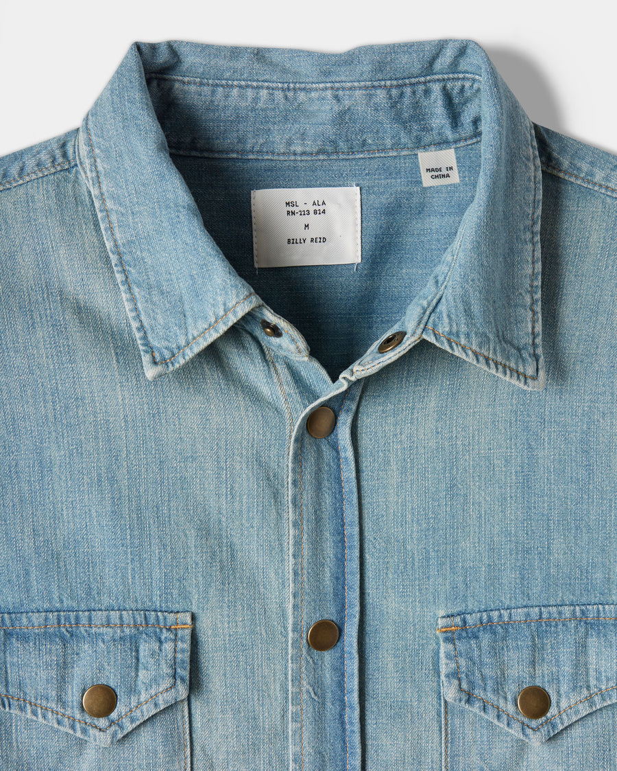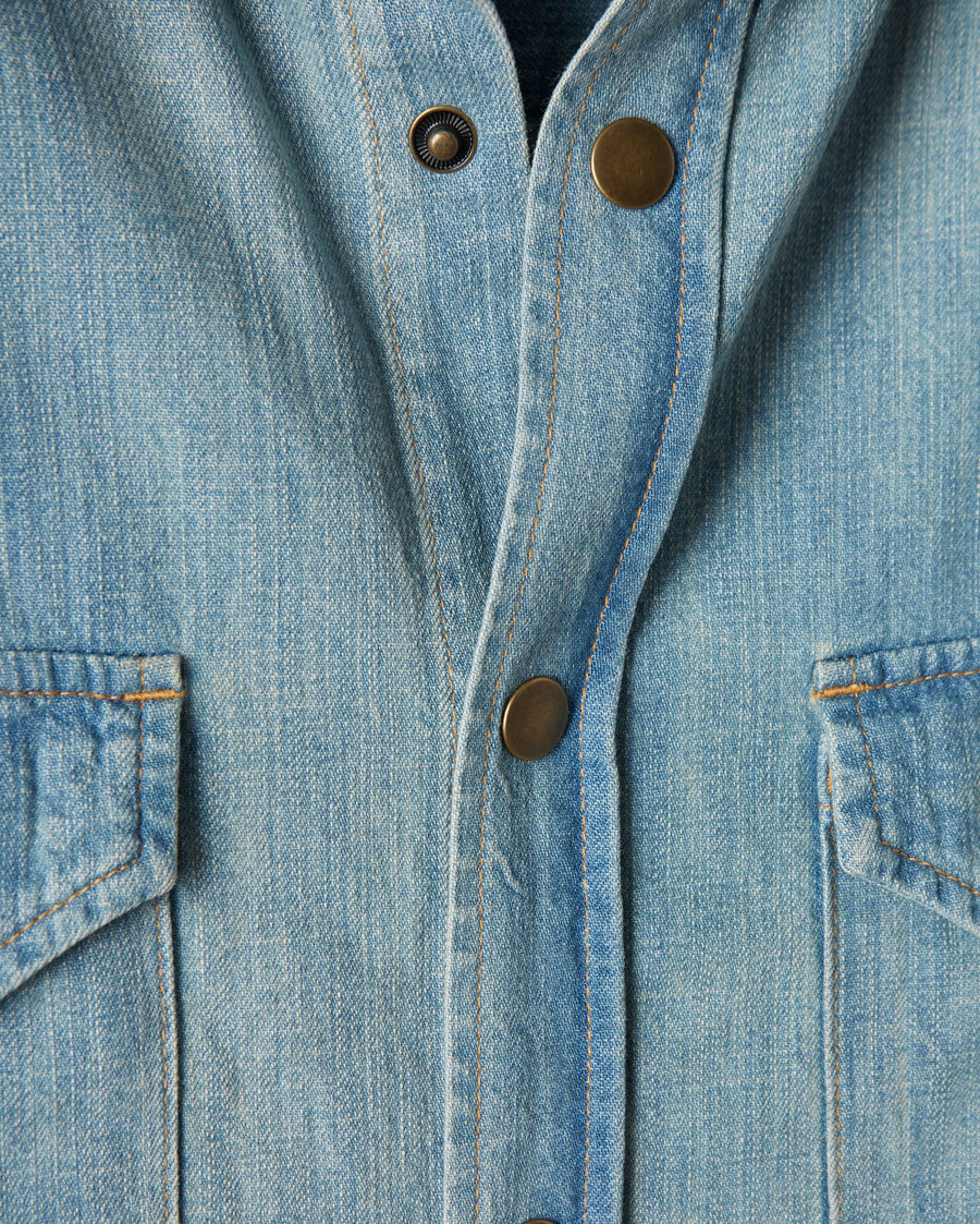 Our iconic denim shirt is pre-washed for a perfectly broken-in look and feel. Finished with antique brass snaps at the chest and placket, and our distinctive ribbon stitching at the left breast pocket.
